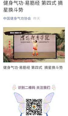 “中国健身气功协会微信公众号平台”由国家体育总局健身气功管理中心主办,面向社会开放。该课程视频自2020年1月8日推出以来,得到健身气功工作者和练习者广泛关注和肯定,更加有力地推动了我校面向公众、服务社会作用的发挥。
