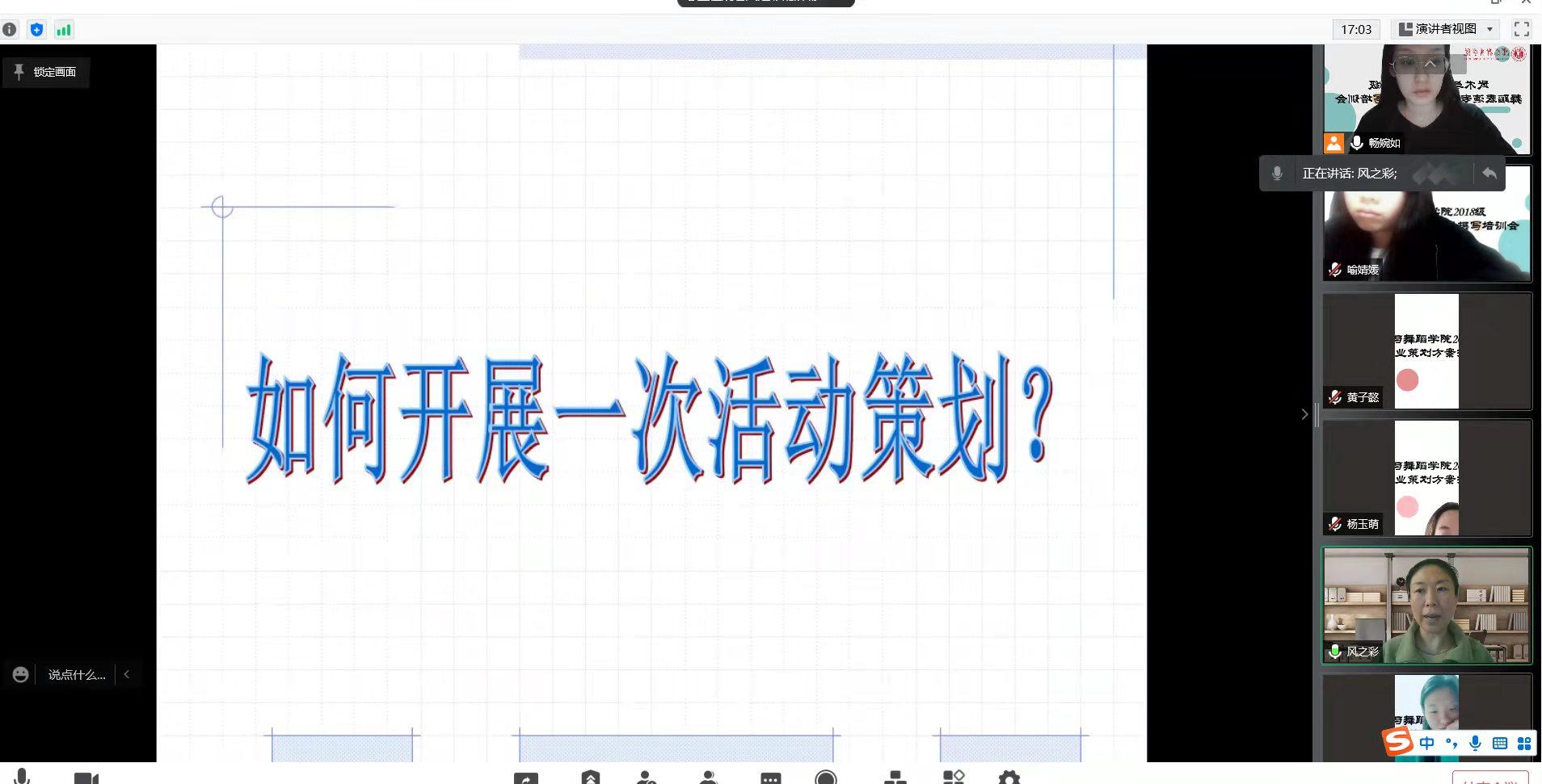 2022年3月30日晚7:30,为保障学生疫情期间的实习效果,做到停课不停学,增强学生的就业竞争力。武术与舞蹈学院召开了舞蹈表演专业2018级活动策划方案撰写培训会,本次会议由2018级辅导员丁战锴主持,杨浏老师主讲。