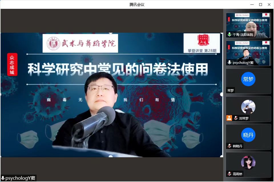 4月16日,武术与舞蹈学院举办第28期攀登讲坛系列学术讲座,邀请运动人体科学学院窦广波副教授通过腾讯会议为全体教师和研究生线上进行了题为“科学研究中常见的几种问卷法使用”讲座,讲座由副院长于海主持。