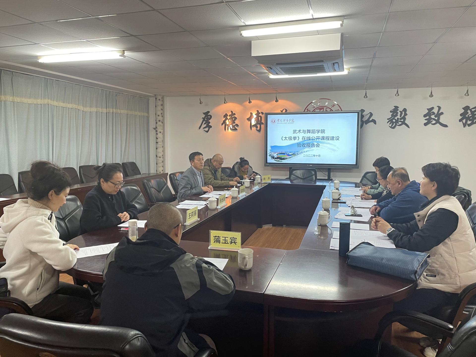 为加强武术与民族传统体育国家级一流专业建设,打造高质量在线课程,10月11日下午,武术与舞蹈学院在武术体操馆会议室召开了《太极拳》在线公开课程建设验收报告会。二级学院教授委员会专家常波、赵秋菊、付哲敏、冯晓辉教授担当评委,院长邹本旭、副院长于海、王莉丽、太极拳课程小组成员参加会议,会议由副院长王莉丽主持。