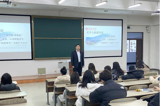 11月25日下午,武术与舞蹈学院党总支学生党支部在教学楼211教室分年级召开了“两不误、双推进”党员、入党积极分子“向我看齐”支部扩大会议。学院全体学生党员、入党积极分子参加会议,学生党支部书记丁战锴主持会议并作动员讲话。