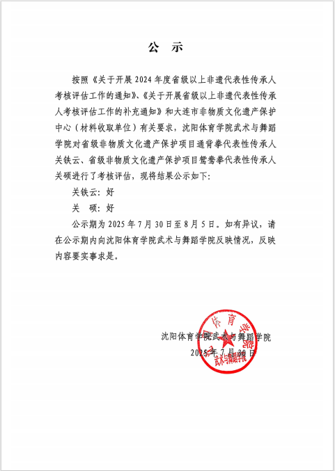 按照《关于开展2024年度省级以上非遗代表性传承人考核评估工作的通知》、《关于开展省级以上非遗代表性传承人考核评估工作的补充通知》和大连市非物质文化遗产保护中心(材料收取单位)有关要求,沈阳体育学院武术与舞蹈学院对省级非物质文化遗产保护项目通背拳代表性传承人关铁云、省级非物质文化遗产保护项目鸳鸯拳代表性传承人关硕进行了考核评估,现将结果公示如下: