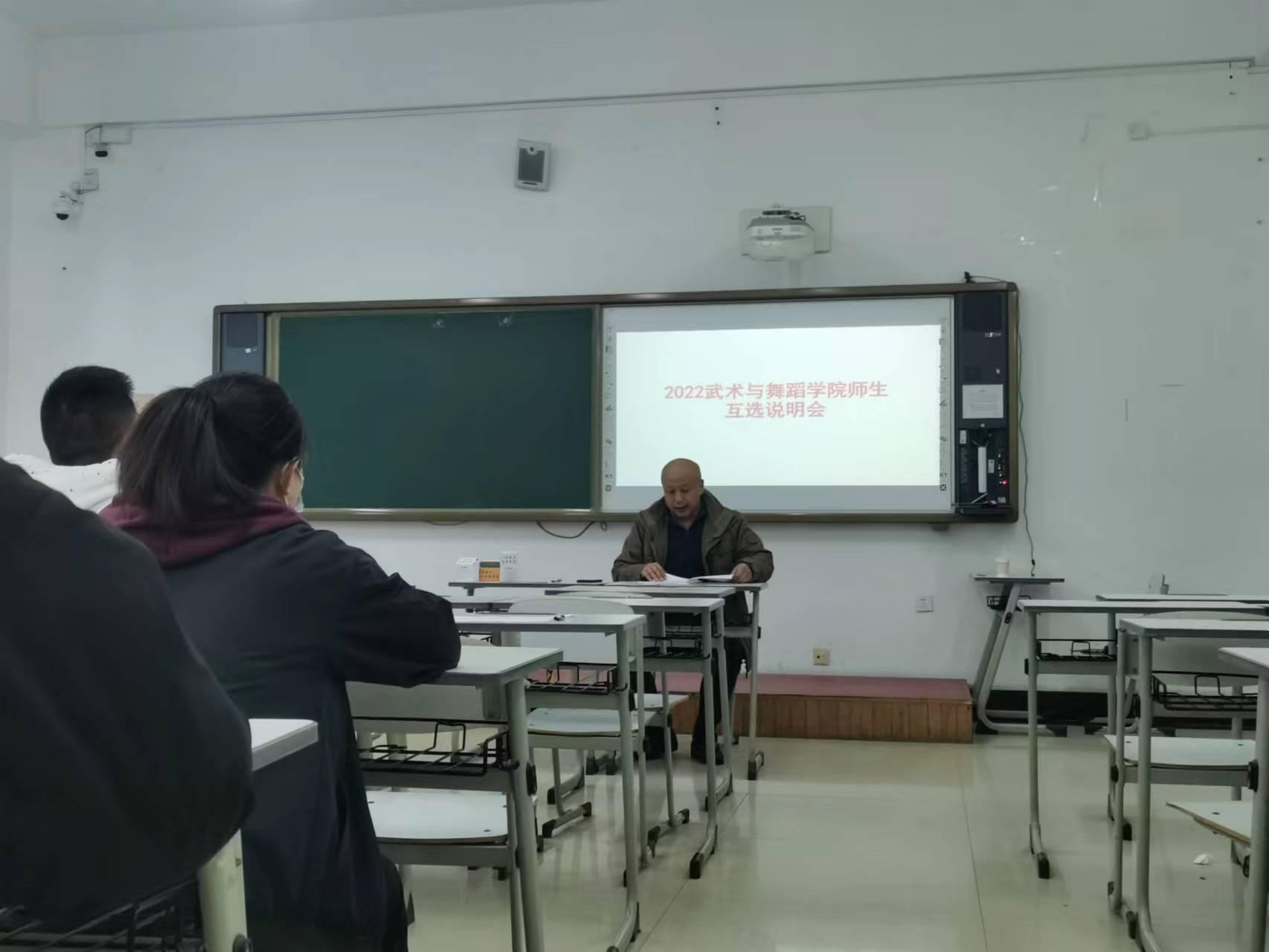 根据《关于开展2022级硕士研究生与导师互选工作的通知》(研学字[2022]28号)要求,武术与舞蹈学院于10月10日中午分别在教学楼101、103教室召开民族传统体育专业和体育艺术方向硕士研究生师生互选说明会。会议分别由副院长于海、王莉丽主持,2022级全体研究生参加会议。